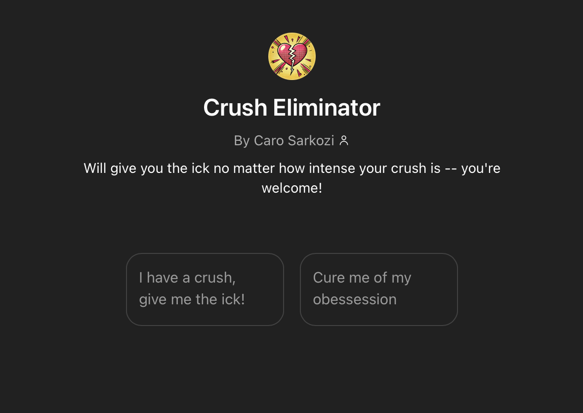 Crush Eliminator: Breaks the spell of a crush by helping running the user through scenarios that might give them “the ick”.