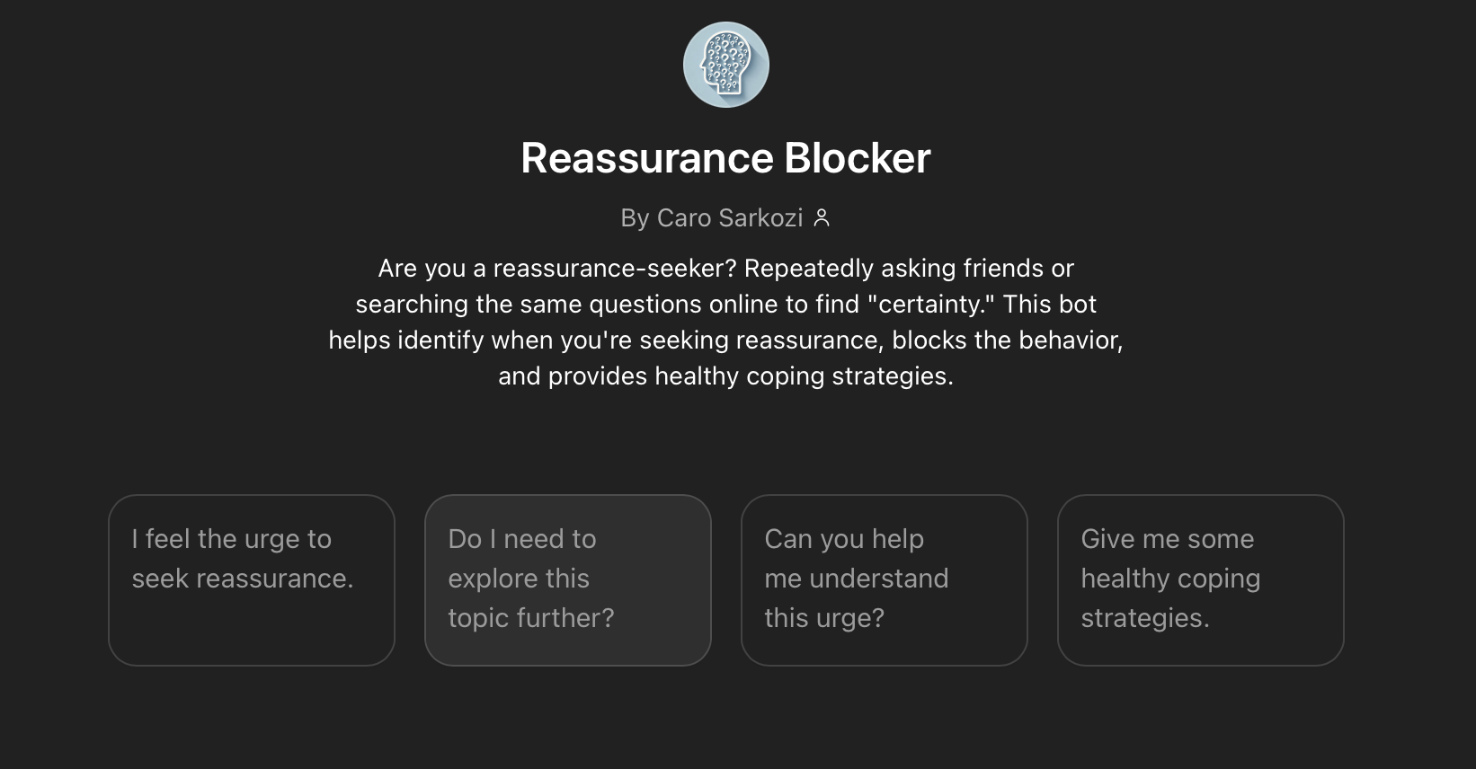 Reassurance Blocker: Made to help those struggling with OCD to be able to still use ChatGPT without it aiding in destructive tendencies. This bot allows the user to use all normal functions until it detects they are seeking reassurance and then redirects them to a healthy coping behavior.
